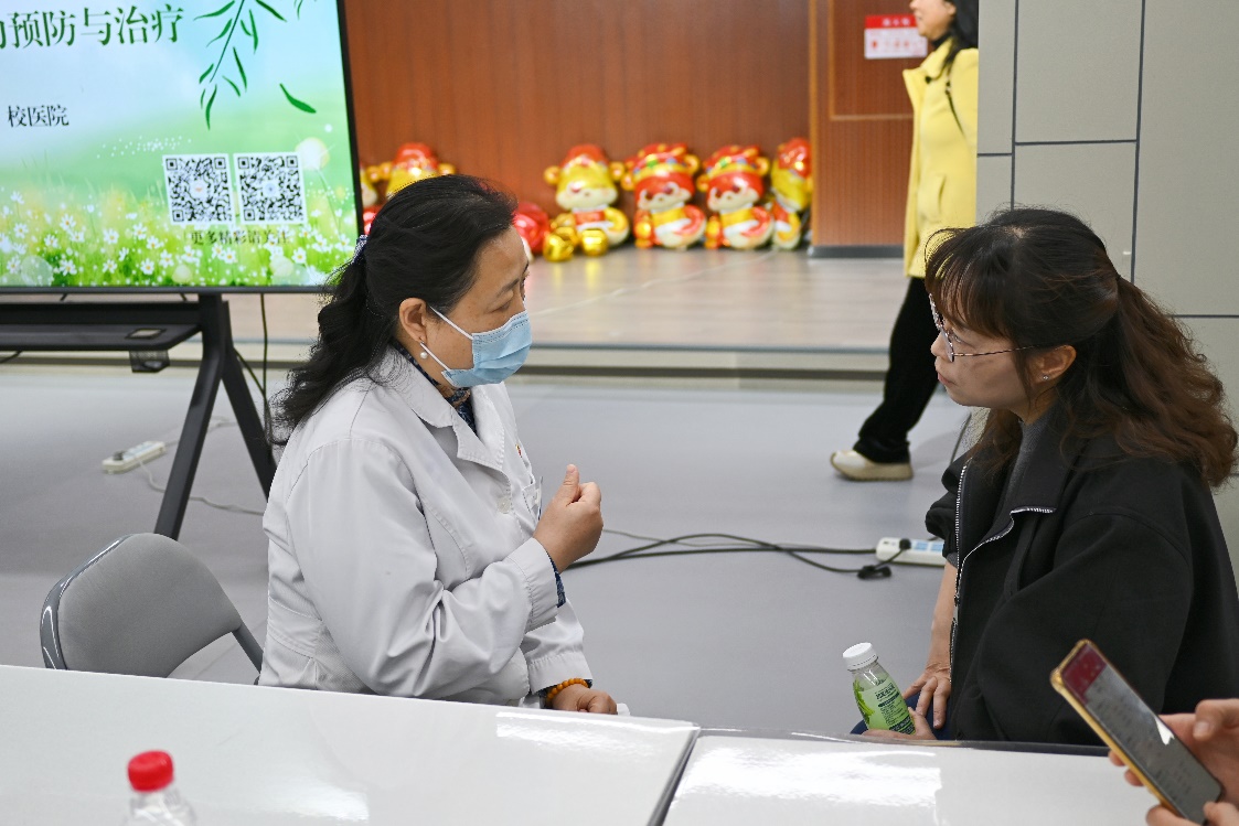 活动中,校医院医生团队结合教职工体检情况,详细梳理了肺结节、幽门螺旋杆菌感染、甲状腺功能指标异常等常见问题的成因与应对策略,重点解读了HPV病毒传播途径及预防措施,并针对发热护理等日常健康问题提供了切实有效的建议。教职工们围绕心脑血管疾病防治、HPV疫苗适用人群及接种流程等话题踊跃提问,医生们结合临床经验逐一解答。在一对一咨询环节,教职工们就自己和家人关心的问题,与现场的校医院妇科、心血管科、全科等领域医生进行了深度交流,现场氛围轻松活跃。