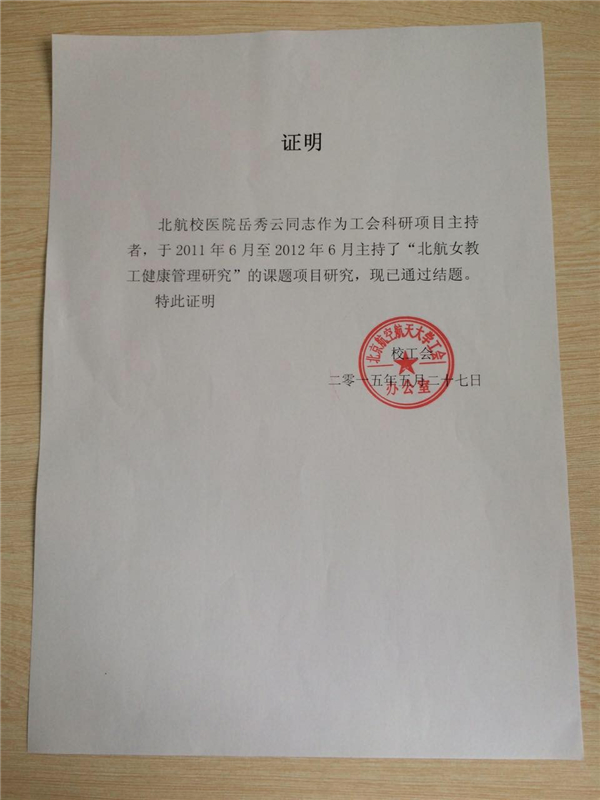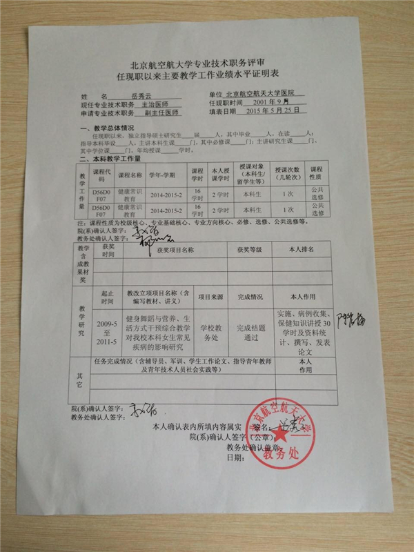 校医院职称评审初评组于2015年5月29日对今年申报副高职称的岳秀云同志进行了初评。经过九名校外及校内专家的考核,岳秀云同志通过了初评。
