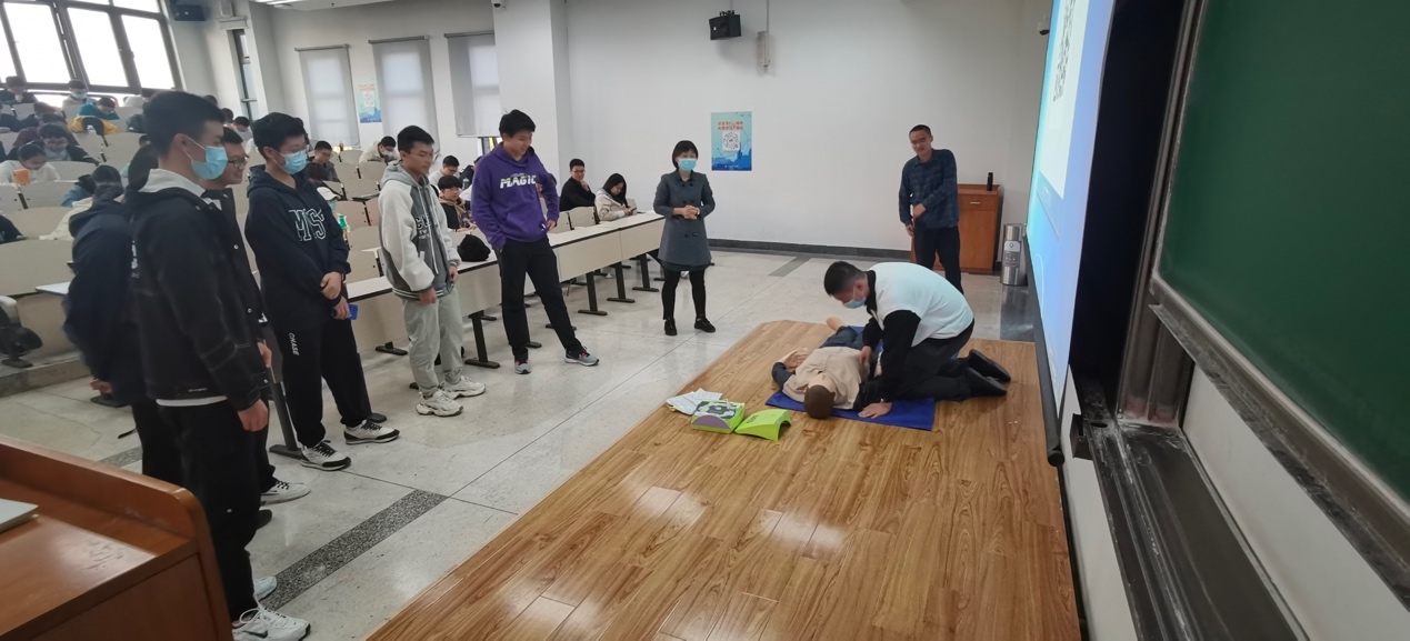 课堂现场,董艳华老师通过引入案例、理论讲授与救护技能实操相结合的方式,向同学们详细讲解了救护概念、心肺复苏操作、常见突发事件的处理方法等方面的救护知识。利用模拟人向同学们演示了心肺复苏(CPR)和自动体外除颤仪(AED)操作使用方法,并指导同学们现场进行模拟急救操作。通过培训,同学们纷纷表示学到了十分实用的急救技能,对自己及身边的人来说都多了一份应急救护的保障。