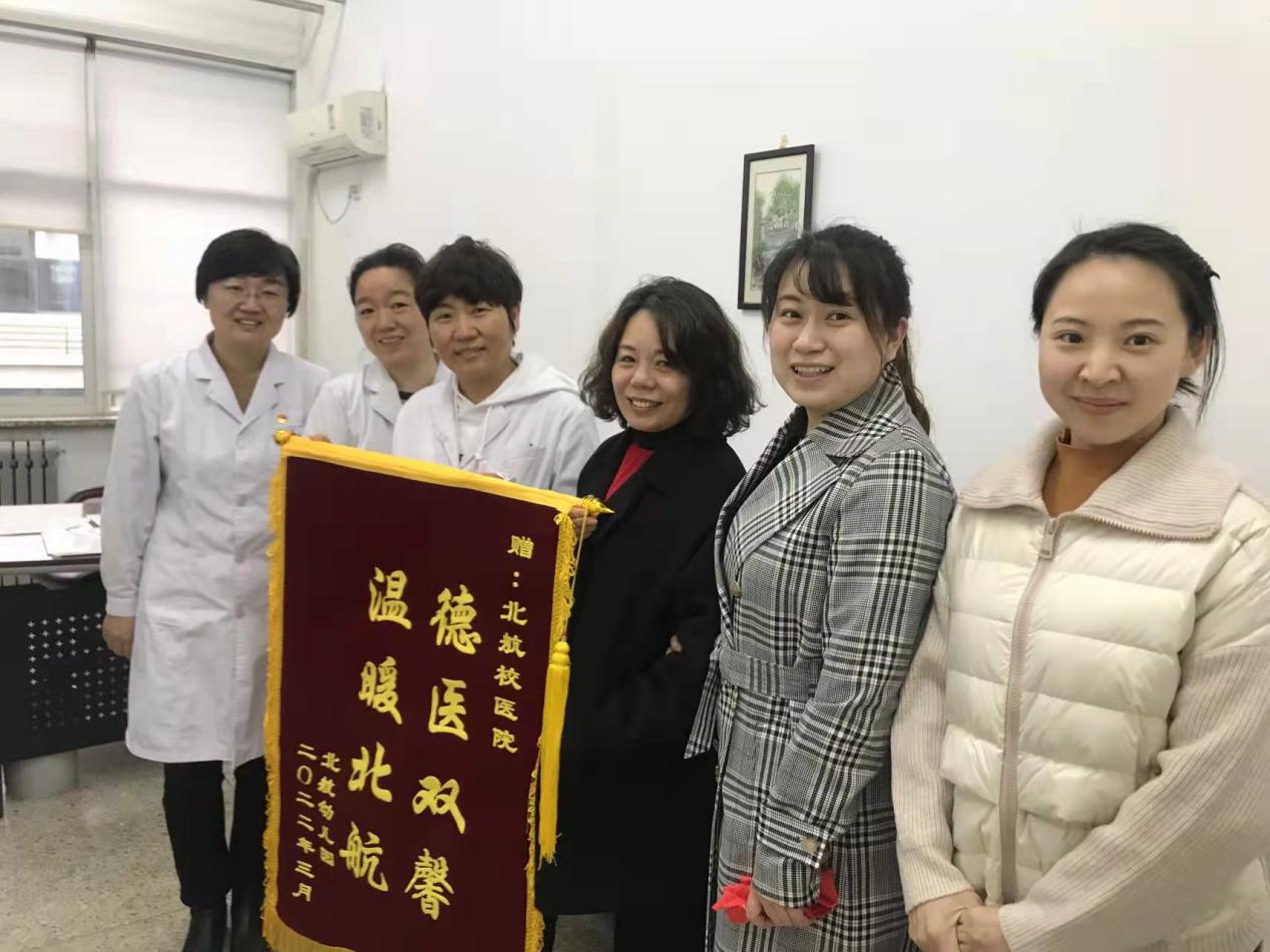 3月9日和10日下午,校医院第一党支部组织医院妇儿中心、中医康复理疗科和检验科的6名党员分别走进图书馆和幼儿园做健康咨询,校医院党总支书记高静带队,各党员医生们通过仔细的问诊和辨证,为有不同需求的老师提供了健康咨询解答,康复建议和健康指导,并为老师们详细解读了体检报告和化验单结果,获得老师们的好评,3月11日,幼儿园教师代表为校医院送上“德艺双馨、温暖北航”锦旗。