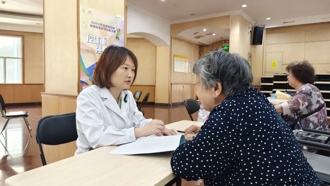 6月26日上午在北航社区居委会活动现场,门诊部冯士生主任等医护人员正为居民测量血压,耐心解答健康疑问“您的血压很稳定,继续保持!”。