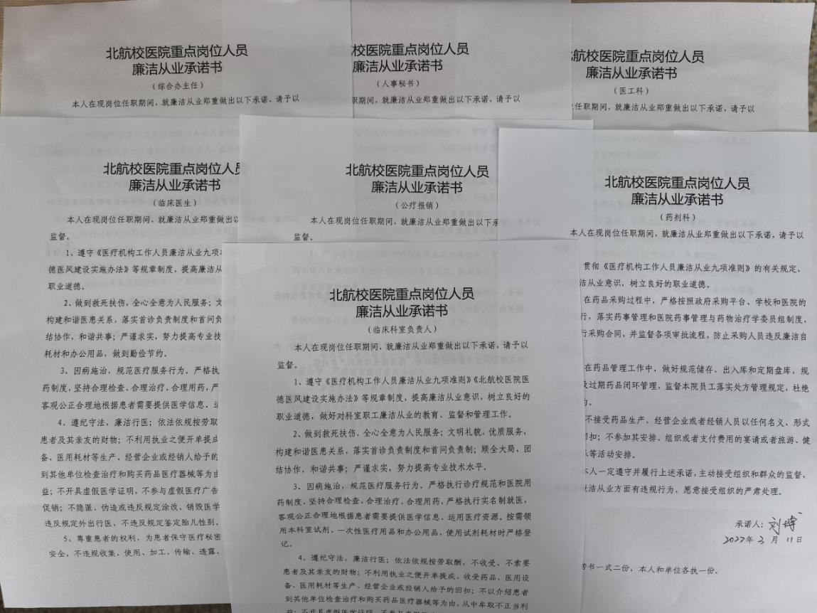 在随后的廉洁从业承诺仪式中,由临床医生、综合行政、药剂和医工岗位的廉政风险重点岗位人员代表上台宣读并现场签订承诺书,医院根据岗位特点,共制定九类廉洁从业承诺书,涵盖了医院廉政风险防控体系中的17项防控措施和相关制度规定,覆盖了重点岗位人员55人。