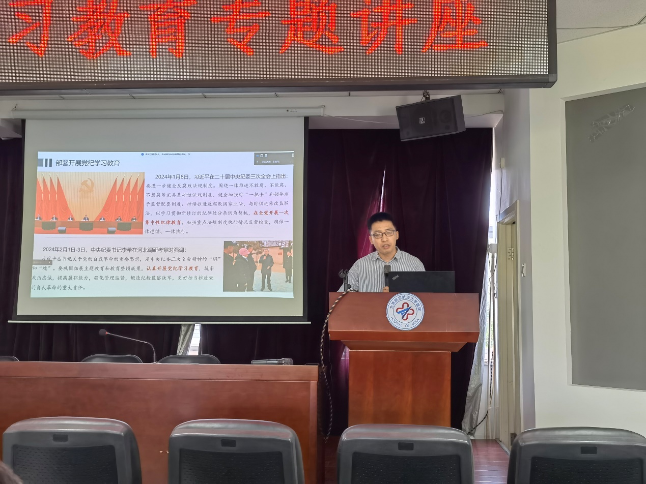 为深入贯彻落实习近平总书记关于党纪学习教育的重要讲话和重要指示精神,推动党纪学习教育走深走实,2024年6月14日,校医院邀请我校马克思主义学院副教授刘佳老师为全体职工作《谈谈党的纪律》专题辅导报告。